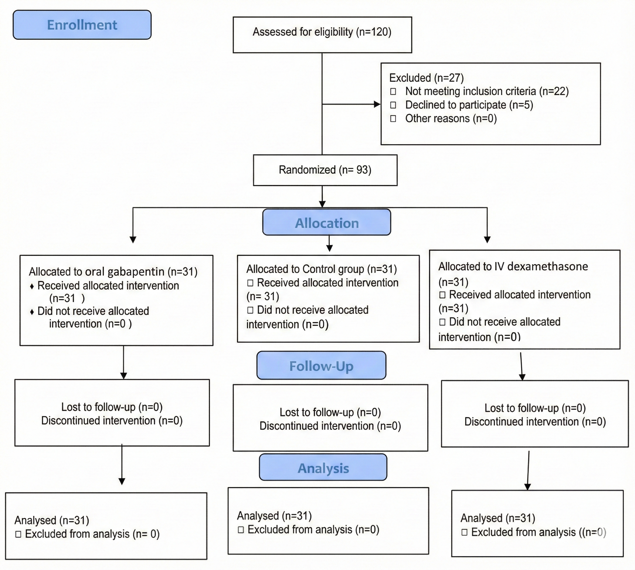 In this randomized clinical trial, 93 women scheduled for elective hysterectomy at Ayatollah Mousavi Hospital in Zanjan in 2023 and 2024 were enrolled and randomly assigned into three equal groups (n=31 each): Group G (oral gabapentin), Group D (intravenous dexamethasone), and Group C (control group with no premedication).