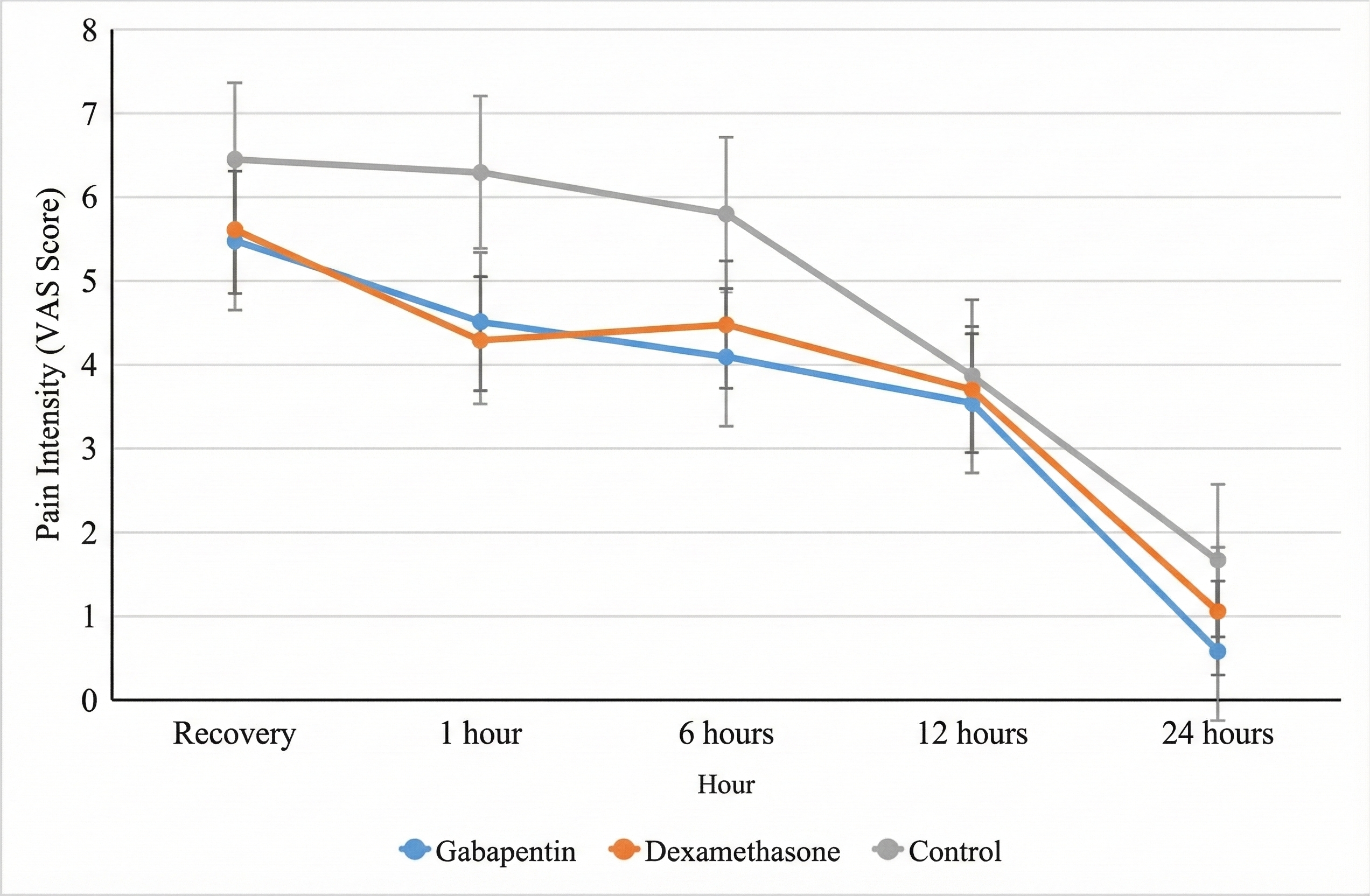 Results: Both the gabapentin and dexamethasone groups demonstrated significantly lower pain scores compared to the control group at all time points (p < 0.001). No significant difference was observed between gabapentin and dexamethasone up to 12 hours postoperatively ; however, at 24 hours, gabapentin provided lower pain scores (nominal p = 0.029; this difference did not persist after Bonferroni correction). The need for rescue analgesics and the incidence of nausea/vomiting were significantly lower in the intervention groups compared to the control group (p = 0.013 and p = 0.005, respectively). No serious adverse events were noted.